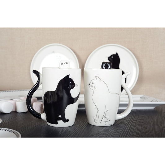 BLACK AND WHITE CAT CUPS WITH TAIL-SHAPED HANDLE - SET OF 2