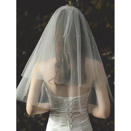 Elegant Two-tire Bride Veil with Small Pearls