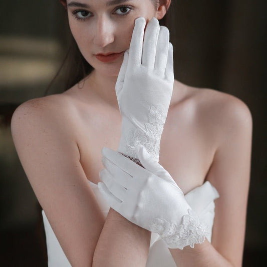 Satin White Bridal Gloves with Lace Flowers
