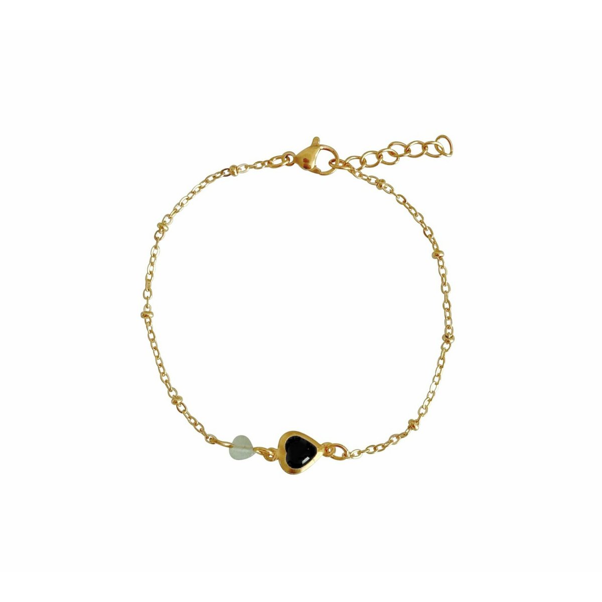 Aventurine & Crystal Heart Bracelet, made of stainless steel. The Aventurine stone has the shape of a heart. The black heart has a beautiful sparkle and is made of crystal glass. This subtle bracelet makes your outfit extra sparkle!