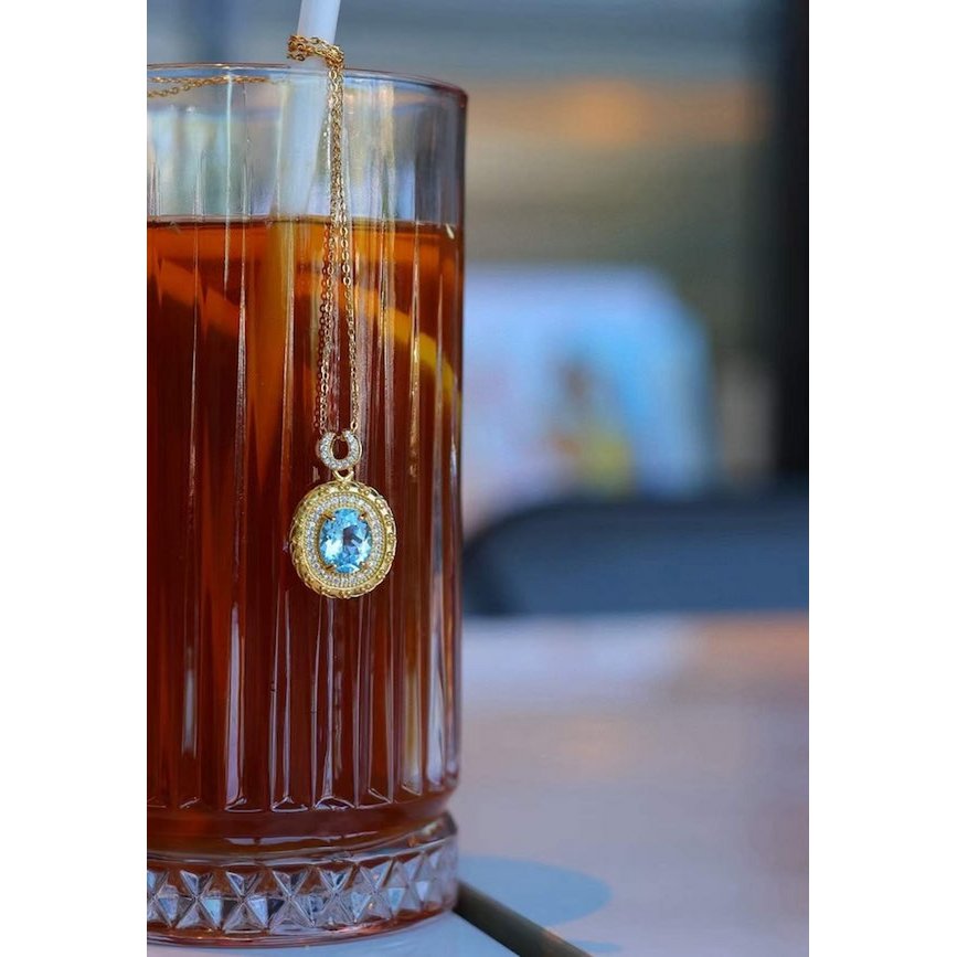 At the heart of this pendant lies a faceted oval topaz stone, measuring 2.5cm by 0.8cm. The genuine blue topaz captures the essence of calm waters and clear skies, radiating a sense of tranquility and serenity. Its expertly cut facets allow the stone to play with light, creating a mesmerizing dance of colors.Encircling the topaz is a frame that truly sets this pendant apart. The frame is double-lined, meticulously adorned with zirconias that add a brilliant touch of sparkle. The pendant hangs gracefully from a gold vermeil chain, which has an adjustable length to suit various necklines and preferences. This chain perfectly complements the pendant's design, ensuring that every detail of the piece is harmonious.