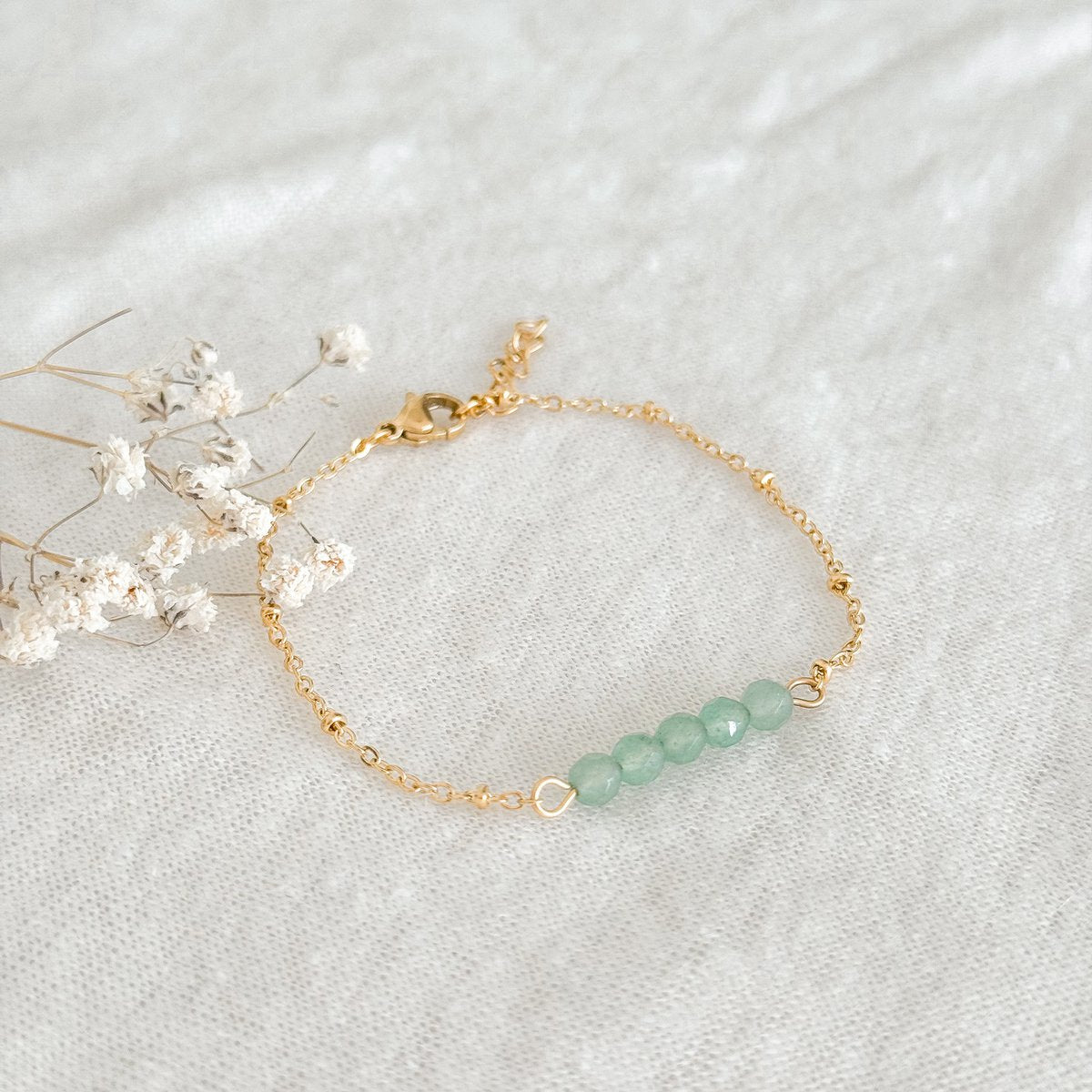 The five small Aventurine stones are cut facet, so they give that little bit of extra sparkle. Without being excessively striking. Minimalist, yet with character.