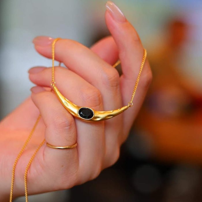 This Egyptian style necklace is the perfect accessory for those who love unique and stylish jewelry. The necklace features a stunning organic shape, with a captivating blue Lapis Lazuli stone or Black Spinel stone placed in the center, creating a beautiful contrast against the gold plating. The design exudes a vintage charm that adds a touch of elegance to any outfit. The necklace with lapislazuli is crafted with brass material, coated with 18k real gold plating; while the necklace with black spinel is crated with gold vermeil. The necklace is adjustable, with the length of 40+10cm.