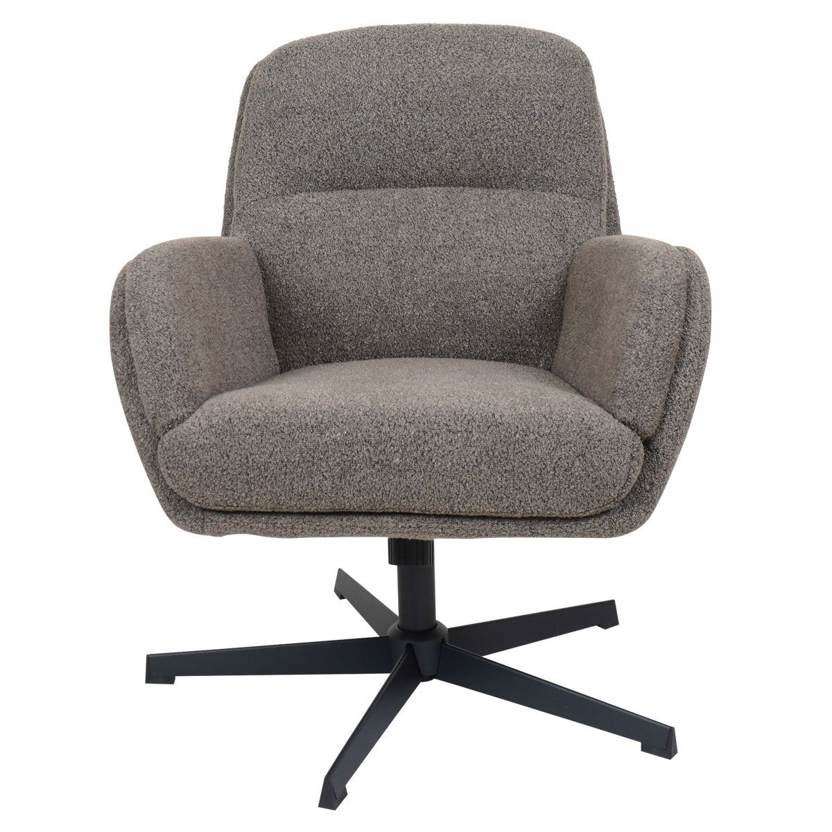 The Louise Brown armchair fits in any interior with its simple and modern design! The chair is covered with a soft bouclé fabric in a warm brown shade, which ensures a luxurious and cozy look. The armchair leans backwards with pressure, so you can sit back in it. Moreover, the flowing lines of the armrests ensure an elegant and inviting appearance, perfectly for relaxed. The sturdy, black metal 360 ° degrees rotatable base ensures stability and flexibility. Ideal for the living room, office or a cozy reading corner!