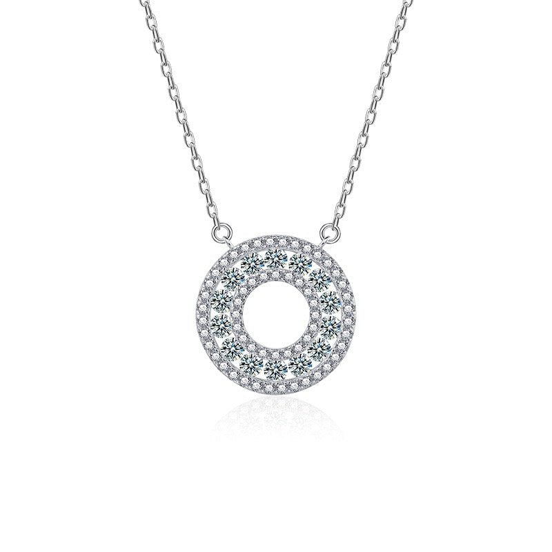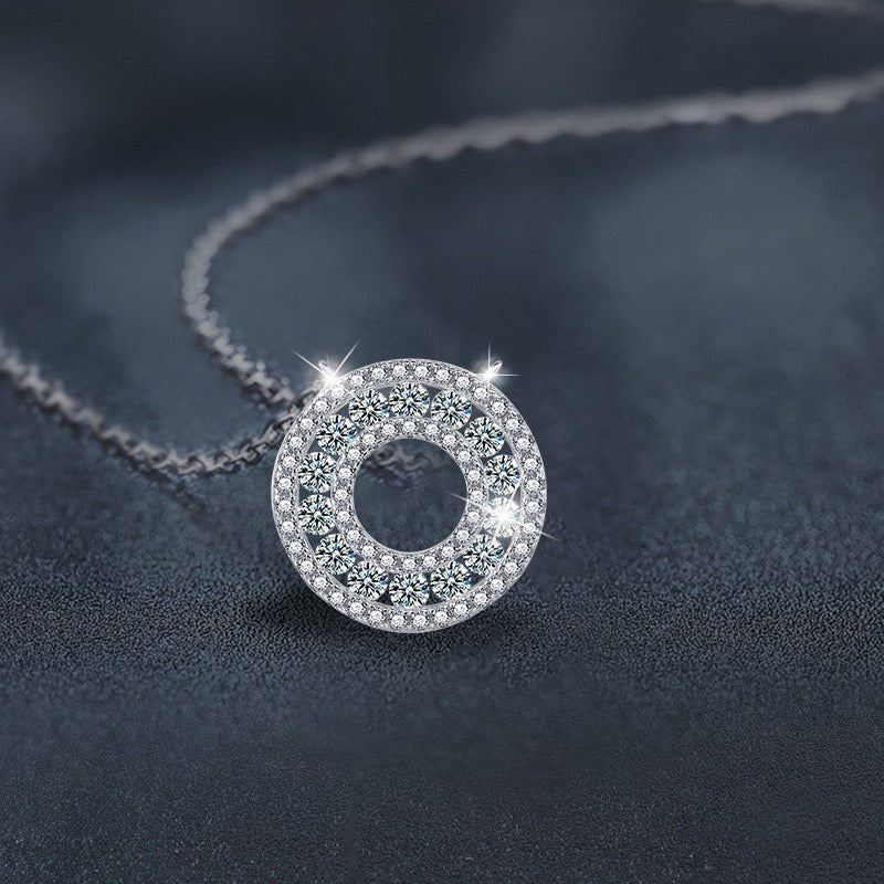 This radiant circle Necklace features an eye-catching orbit design that sparkles from every angle. Its layered halo of moissanite stones creates a bold, luminous look while remaining elegant enough for daily wear. A perfect balance of modern minimalism and statement shine, this piece makes a thoughtful and stylish gift for someone special. 925 sterling silver chains and frame. 14 pieces of 2.5 mm moissanite stone. It comes with the GRA certification in delivery. Pendant diameter is 1.8 cm 40+5 cm adjustable chain Moissanite vs Diamond - Composition: Moissanite is silicon carbide, while diamonds are pure carbon. - Hardness: Diamonds rank 10 on the Mohs scale, moissanite ranks 9.25. - Brilliance: Moissanite has more sparkle and colorful flashes than diamonds. - Cost: Moissanite is about 90% cheaper than diamonds. - Ethics: Moissanite is lab-created, making it more eco-friendly and ethical than mined diamonds.