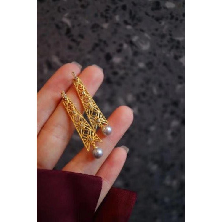 Elevate your style with our royal-inspired drop earrings, featuring a stunning combination of sparkling zirconia and genuine grey Akoya pearls from Japan.Measuring at an overall length of 8cm, these earrings make a bold statement while remaining sophisticated and timeless.The earrings are made from solid silver, with the golden accents plated in a thick layer of 18k gold using advanced vacuum plating technology. This gold vermeil finish ensures that they won't discolor over time.Don't miss out on this limited stock item—grab yours before they're sold out!