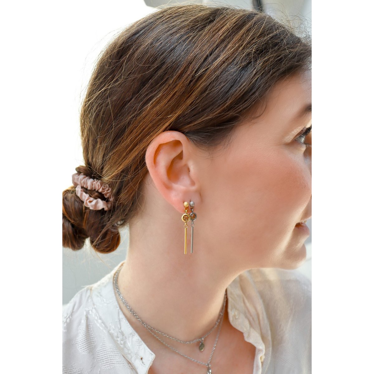 Silver diamond earrings, made of stainless steel. The diamond has a brown color and has a beautiful sparkle. The stud itself has a frosted look, which makes it extra special. The silver earrings are hypoallergenic, durable, colourfast, strong and affordable.