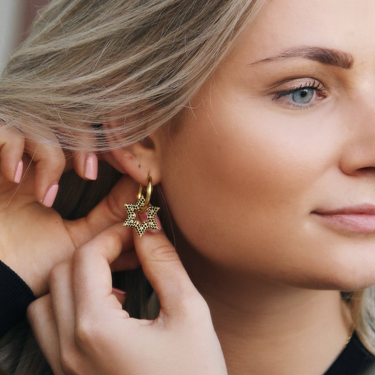 Stainless steel hoop with crystal star - black/gold