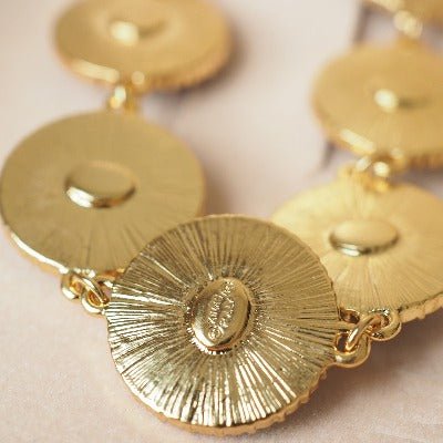 These bracelets feature large coin-shaped beads, each measuring 2cm, adorned with intricate and luminous sleeping angel face Cameo reliefs. The ethereal beauty of these bracelets is accentuated a purple color, providing a versatile and enchanting accessory for any occasion.The coin beads are meticulously contoured with rainbow-glowed small stones, adding a touch of mystique and allure to the overall aesthetic. The bead frame is fashioned from brass and gold-plated, ensuring durability and a luxurious finish. The total length of the bracelet is 20cm, having a comfortable fit for a variety of wrist sizes. Embrace the vintage soul embodied in these bracelets, making them the perfect gift for your beloved.