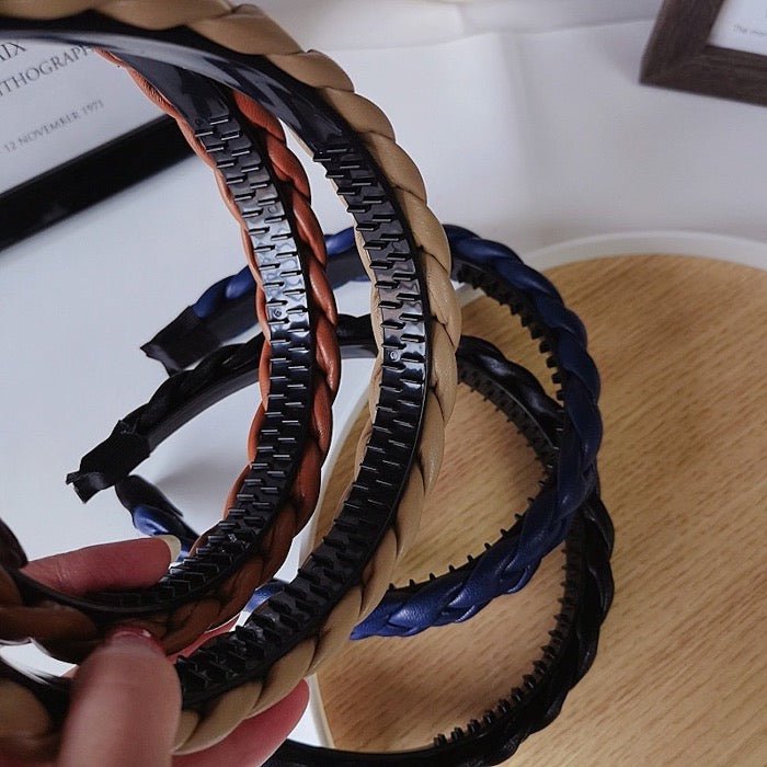 The Vintage Style PU Leather Braided Headband, a timeless accessory available in an array of captivating colors: classic black, deep navy blue, warm cappuccino, and rich cognac.Crafted with precision from PU leather, this headband exudes sophistication and enduring elegance. Its comfortable 2.7cm width and secure 39cm perimeter guarantee a snug and comfortable fit, ensuring it stays in place throughout your day.