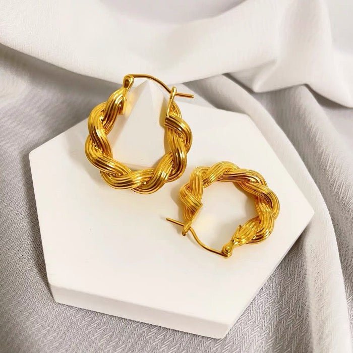 These hoop earrings boast a detailed and artfully crafted braided pattern, adding a touch of vintage charm to your ensemble. Made from high-quality brass and feature a real gold-plated finish.With dimensions measuring 2.5x2.8cm, these earrings strike the perfect balance between subtlety and impact.